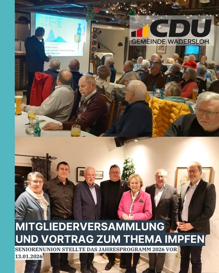 Die Mitgliederversammlung der Seniorenunion am Dienstag, 13. Januar 2026, in der "Alten Brennerei" bei Karger in Wadersloh war, wie immer, sehr gut besucht. ➡️ Ein spannender Vortrag von Dr. Wollweber über verschiedene Impfungen, die vor allem auch für die Senioren sehr empfehlenswert sind, stand im Mittelpunkt der Versammlung. ➡️ Bürgermeister Christian Thegelkamp sprach über die aktuelle Haushaltslage der Gemeine Wadersloh. Er betonte, dass die hohe Pro-Kopf-Verschuldung in Wadersloh zu vertreten sei, da sie als Folge von investiven Ausgaben entstanden sei, die das Gemeindevermögen fast in gleicher Höhe verbessern würden. ➡️ Stellv. Landrat Rudi Luster-Haggeney informierte über die aktuelle Haushaltslage des Kreises. Er bedauerte zwar die immer weiter steigende Kreisumlage, die die Gemeinden an den Kreis zu zahlen haben, wies aber auch darauf hin, dass die Personalausgaben und die Sozialleistungen des Kreises sich ständig erhöhen würden. ➡️️ Der ehemalige Landrat des Kreises Warendorf und neu gewählte Vorsitzende der Kreisseniorenunion Dr. Wolfgang Kirsch nutze an dem Abend die Möglichkeit und stellte sich den Anwesenden vor. Nach dem traditionellen Grünkohlessen und dem Jahresbericht 2025 wurde das Programm für 2026 vorgestellt. ℹ️ Das aktuelle Jahresprogramm der Seniorenunion Wadersloh ist unter www.cdu-wadersloh.de (Über uns > Seniorenunion) zu finden. #cdu #seniorenunion #mitgliederversammlung #2026 #vortragmpfen